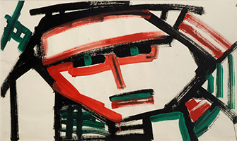 Après cette recherche de l’accident ou dominent le noir et le blanc dans un entrelacement de taches amenuisées en filets La tache en mouvement, 1982 Frère Jérôme délaisse cet accident par le geste et part à l’exploration de la tache pour l’euphorie de la forme et de la couleur. Il réalise un impressionnant corpus d’œuvres sous la thématique du jardin dont le mouvement d’ensemble très voluptueux confirme que l’homme et le peintre sont à l’aube « des jours heureux ». Les formes nouées comme des gerbes Aspiration,1985 flottent dans l’espace au gré des taches, des couleurs, des textures dans une sorte de confusion picturale où les variantes visuelles laissent toute la place à l’imaginaire du spectateur. À la faveur de ses soixante dix ans de pratique picturale Frère Jérôme a joué un rôle de passeur : passeur de la beauté, passeur de la témérité, passeur de la compassion, passeur de l’humour, passeur de l’anecdote. Ce rôle de passeur est abondamment illustré dans une immense galerie de personnages dont les héros sont nés au début des années cinquante. Sans titre, 1959 En examinant bien ce corpus on a l'impression de feuilleter un album de famille. Chaque tableau raconte une histoire vécue, politique, imaginaire, tragique, poétique. Piquet de grève,1989, Nous y voilà, 1989, Dans une sorte de suspens fantomatique mais dans l’équilibre de la forme, Frère Jérôme met en scène une faune humaine habitée par l’angoisse et le mal de vivre. Les protagonistes de ce théâtre sont courbés, enfermés dans des vêtements couleur d’abandon et de mélancolie. Ils marchent sur une surface incertaine, enfoncés dans une terre sans cesse remuée dont leurs sabots ont du mal à s’extraire, Sans titre, 1991. Frère Jérôme en a fait des figures de soumission et d’isolement en les priant de raconter leurs histoires au monde entier afin qu’un jour les hommes et les femmes vivent dans la lumière, délivrés de toute tristesse agrippée aux pieds.