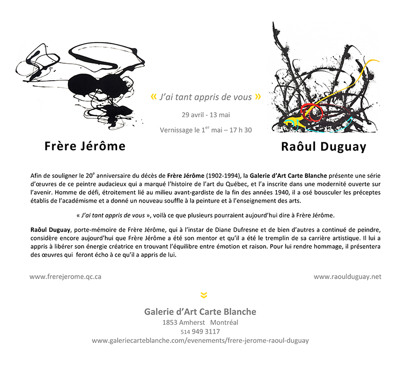 Notice biographique La vie et l’œuvre de Frère Jérôme entretiennent des liens très intimes avec sa quête d’absolu et sa recherche de spiritualité. Cet homme souvent visité par la grâce toujours habité par la passion, est à la fin de sa vie, revisité par les fantômes qu’il s’amuse à faire surgir de son passé. Sa carrière professionnelle occupe deux créneaux précis : L’enseignement des arts plastiques et la réalisation d’un œuvre pictural extrêmement imposant. Frère Jérôme a traversé le vingtième siècle : Né en 1902 à Charlesbourg, il meurt à Laval en 1994 après avoir bien pris soin d’inscrire à son agenda du 30 avril : « aujourd’hui ne me dérangez pas, je suis occupé à mourir. » Visionnaire comme l’étaient les signataires du manifeste Refus Global et certains autres créateurs téméraires, Jérôme a vécu parfois dans la sérénité, parfois dans l’adversité, les nombreux changements sociaux et culturels des années 1940 à 1960. Deux ans d’étude à l’École des Beaux-Arts de Montréal suffiront à l’éloigner définitivement de l’académisme gauchissant alors enseigné pour adhérer sans réserve au mouvement automatiste et par la suite créer grand nombre des autres mouvements qui sont encore d’inspiration constante. Il a donc vécu les époques de la grande noirceur et de la révolution tranquille et assisté aux adieux de « la tuque et du goupillon. » Membre de la Communauté des Frères de Sainte-Croix dès l’âge de douze ans, non seulement il restera fidèle à ses engagements jusqu’à sa mort, mais il pratiquera sa vie de religieux avec une intensité remarquable et exemplaire. En aucun moment, il ne mettra en cause l’existence de Dieu, s’éloignant en cela de la théorie des automatistes. Toutefois, ses nombreux questionnements sur le vrai visage de Dieu hanteront sa production et le conduiront à l’abstraction puisque Dieu lui-même est une abstraction et qu’il appartient à chacun de lui trouver un visage. Avec soixante-dix ans de pratique professionnelle, Frère Jérôme jouit d’une grande attention médiatique. Les médias écrits et électroniques lui ont consacré de très favorables critiques. Il a participé à de nombreux colloques, documents vidéo et rédigé un nombre incalculable d’articles portant sur l’enseignement et les mouvements d’avant-garde. En 1967, il présenta un mémoire à la Commission d’enquête sur l’enseignement des arts au Québec, au Ministère de l’Éducation du Québec. Ses œuvres ont été vues dans plus d’une centaine d’expositions solos et de groupes au Québec, aux Etats-Unis, en Europe et certaines font partie de prestigieuses collections. Thérèse Bélanger Brève analyse de l’exposition thématique J’ai tant appris de vous. J’ai tant appris de vous illustre le potentiel d’audace et de marginalité qui habitait Frère Jérôme dont les œuvres du présent corpus à la Galerie Carte Blanche sont d’inestimables témoins. Ces œuvres entretiennent des liens entre elles. Elles se nourrissent les unes des autres dans le reflet des divers mouvements picturaux ambiants. Certaines très matiérées des années 1959-1965 Sans titre, 1962, rejoignent la sensibilité de Fernand Toupin et de Marcelle Ferron. alors que Montréal, 1969, porte plus loin l’esthétique de l’oblique défendue par Rita Letendre et le hard-edge aux effets cinétiques de Claude Tousignant.